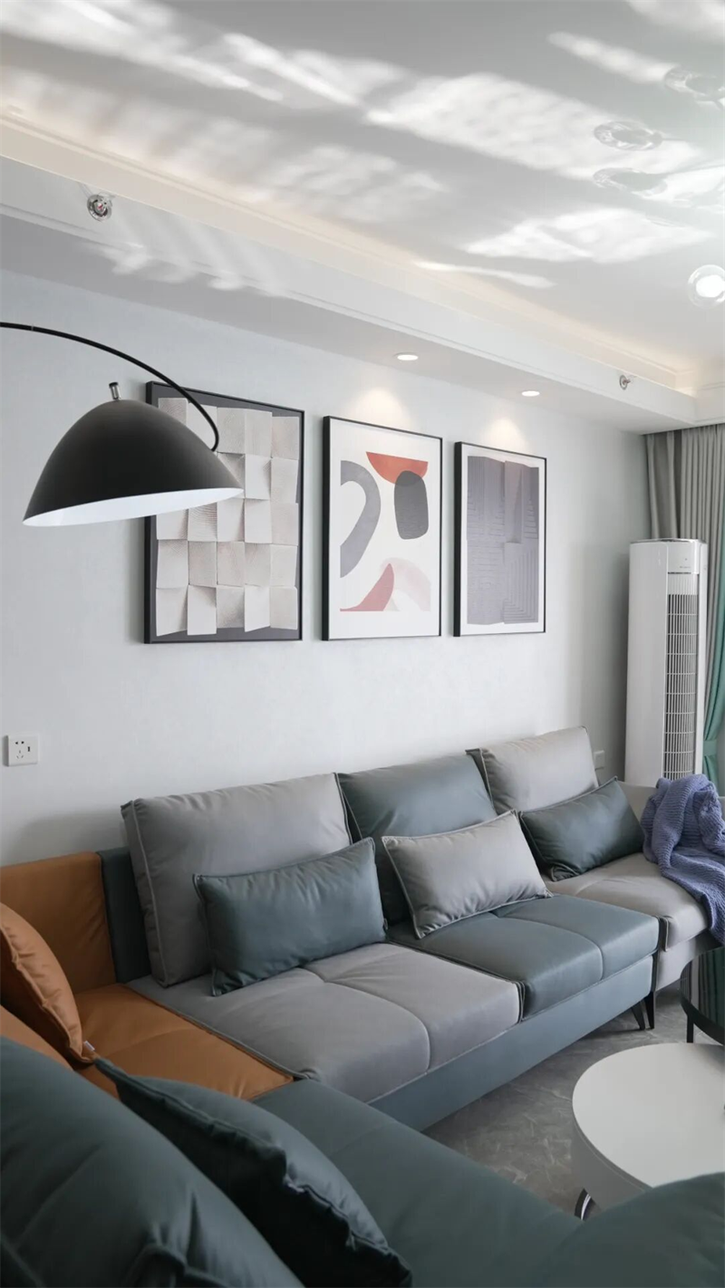墙面三幅抽象艺术挂画错落有致,为空间注入艺术气息,与弧形落地灯共同勾勒出柔和的光影节奏。大面积浅色墙漆与通透采光相辅相成,让整个空间明亮开阔。一旁绿植点缀的阳台区域,将自然生机引入室内,赋予生活更多呼吸感。