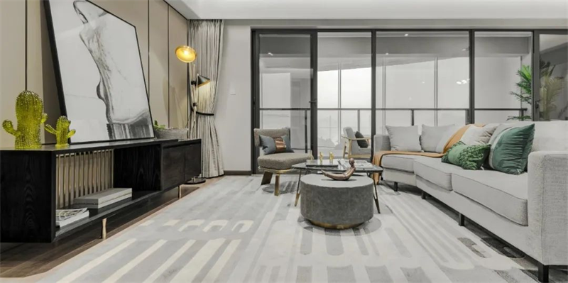 本案采用灰白中性色搭配原木地板为主色调,营造清新简约的空间氛围。室内家具选用了简约设计的灰白色系,搭配金属材质的细节装饰与绿植,使整体空间更显现现代感和奢华感。