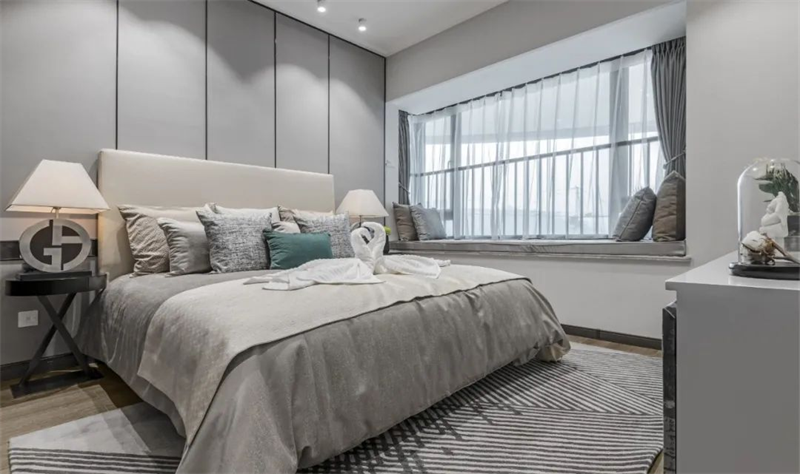 卧室精心挑选了高品质的床具,柔和舒缓的色调给人宁静的感觉。搭配柔软舒适的床品和软装,保证了睡眠质量。同时,考虑到大空间的照明需求,卧室布置的灯具都以温柔的意象为主题,为空间营造了贴心的守护感。