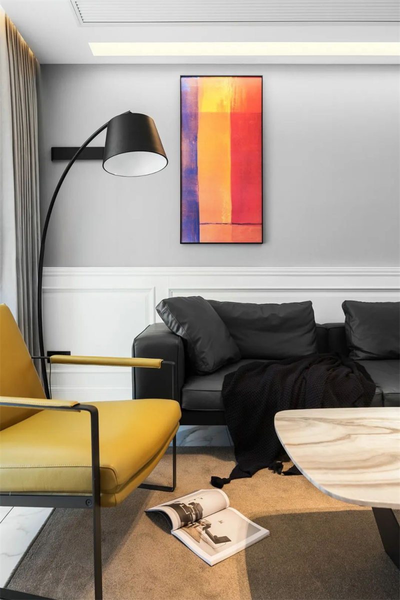 客厅主色调采用灰白墙面与白色大理石地砖搭配,创造出通透明亮的空间感。低调的深色调沙发展现简约品味。通过一些精致的极简设计装饰画和空间摆件,为整个客厅注入一丝艺术氛围。