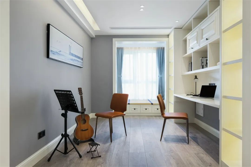 现代简约的书房注重实用性和整体协调性。纯白书桌和书架组合,打造出一个明快而整洁的学习空间。舒适的椅子、明亮的台灯以及一些简约的挂画与乐器装饰,让这个空间兼具工作与休闲的功能。