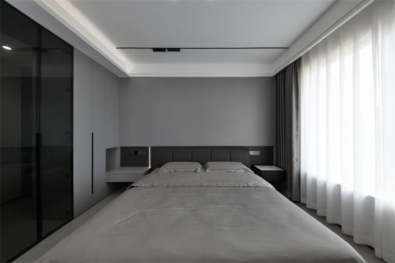 主卧床头背景墙采用整面定制护墙板设计,软包床头靠背舒适贴合,搭配浅灰色床品,低调中透出高级质感。两侧悬空床头柜设计轻盈实用,内置隐藏式灯带,提供柔和夜光照明,兼顾美观与功能性。大窗户配白色纱帘与深色遮光帘,自然光可自由调节,保证私密性的同时引入柔和光线。顶部无主灯设计,结合线性灯带与筒灯,营造层次分明的灯光氛围。