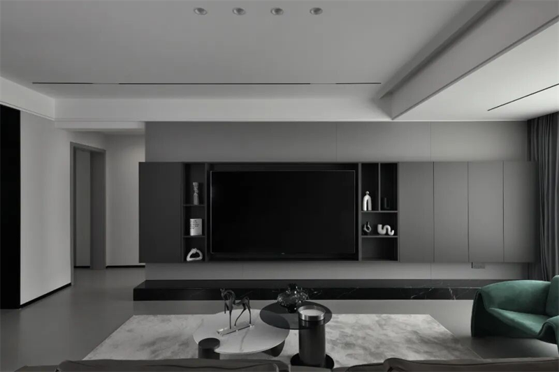 客厅以现代极简风格为基调,整体采用灰黑配色,营造出沉稳内敛的空间气质。电视背景墙采用整面定制柜体设计,深灰色哑光面板与开放式格架结合,嵌入式电视隐藏其中,视觉整洁统一。底部黑色大理石基座提升层次感,兼具装饰与收纳功能。